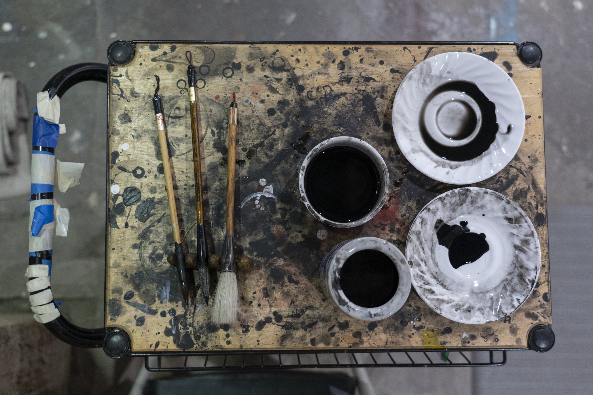 Hong: “The Italian Alcantara material does feel like a thin felt, and it is environmentally friendly. But that is not my intention behind the material selection as a form of resistance, rather a choice of collaboration for visual purposes. In 2019, I was first introduced to Alcantara, a Milan-based textile company, by an Italian curator, Dagmar Lavezzoli, who invited me to participate in her co-curated show ‘Out of the Blue: A Calligraphy Journey through Alcantara’ at Milan Royal Palace. She thought my previous large-scale charcoal drawing would translate well onto this material with the Chinese ink medium. I did some experiments, and it turned out Alcantara material not only could achieve a strong visual effect like my large charcoal drawings on paper but also would solve some problems like charcoal smudges as well as fragilities and mounting issues that Chinese ink on thin rice paper often encountered. Moreover, it can be stretched, hung, sewed, and folded like a 3D sculpture, which I have been interested in.