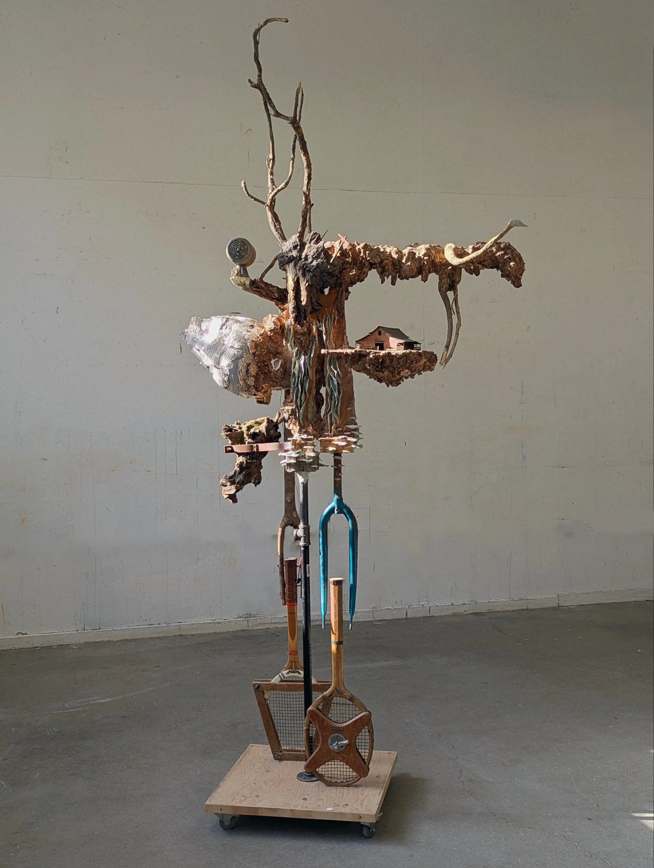Moving On, 2023, 48″ x 42″ x 13″, Wood, brick, wire, epoxy clay, found wood, plaster, soil, flock, dowels, aluminum mesh