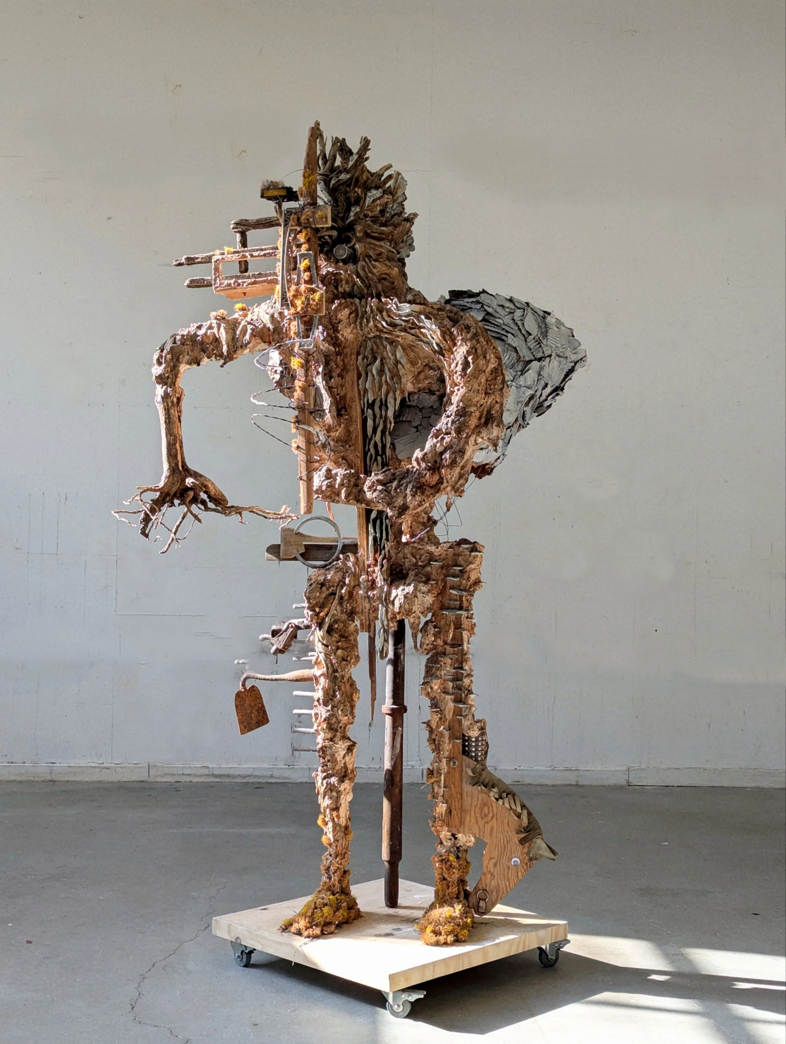 Scarecrow, 48″ x 36″ x 80″, wood, epoxy clay, plaster, foam, LED lights, cardboard, acrylic and found objects