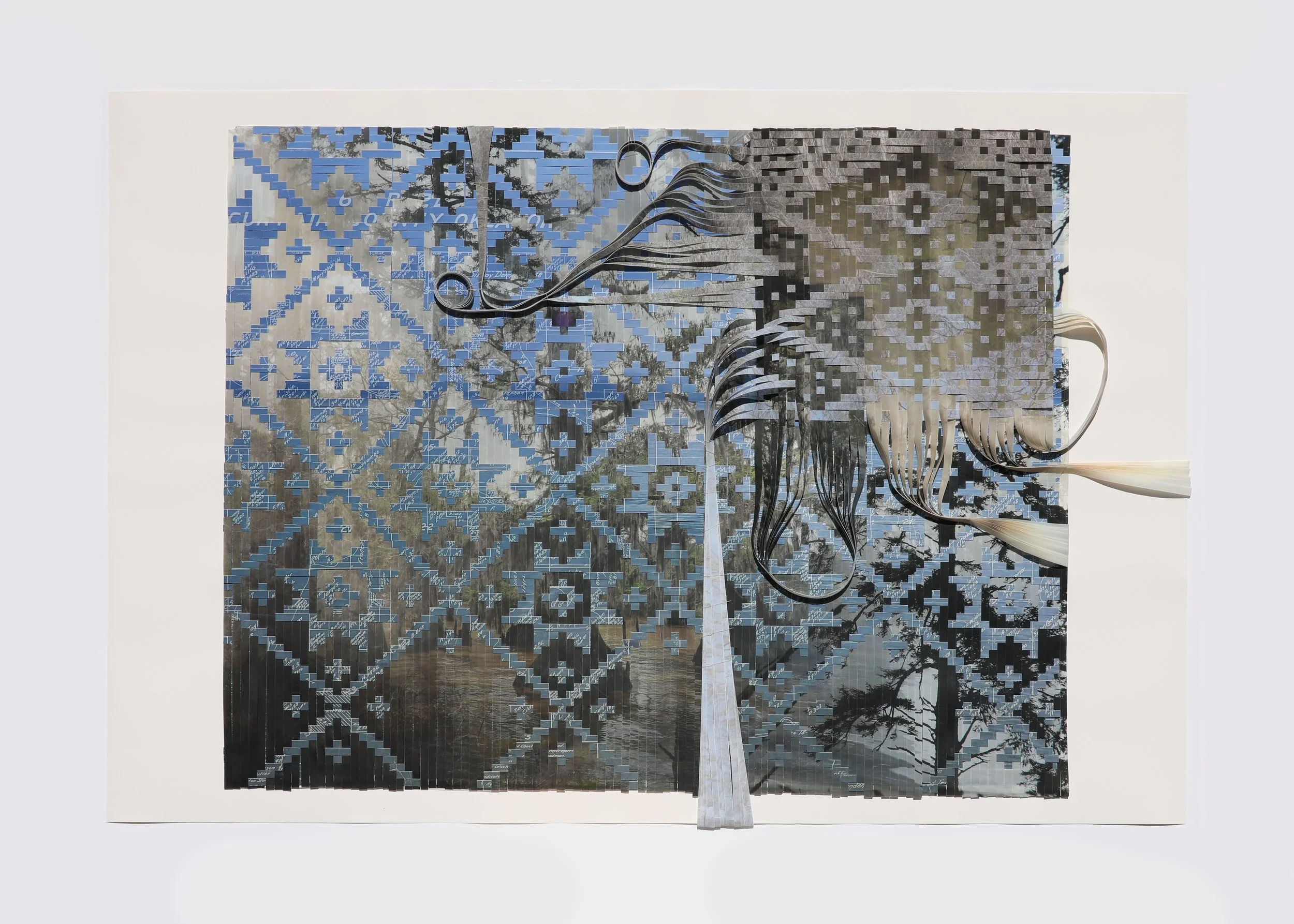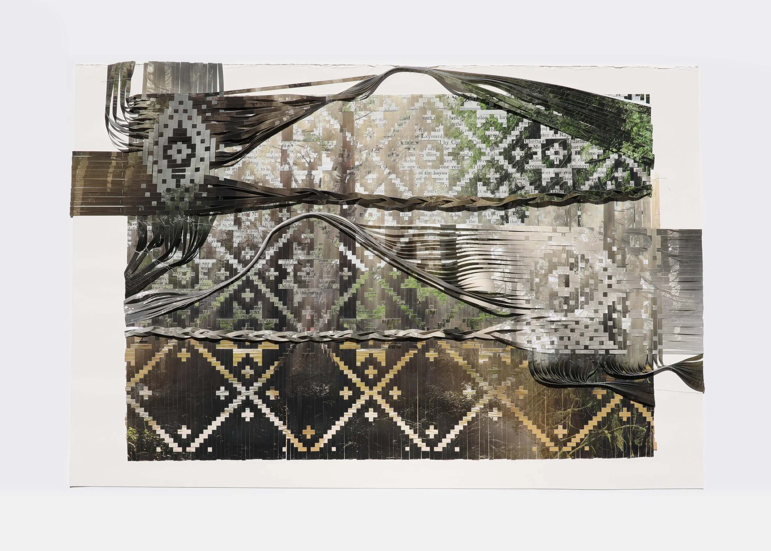 The woven photo-works present a powerful metaphor: colonial violence is not only remembered but materially embedded in the present. Through slicing and weaving maps, treaties, and archival records into landscapes, your work visualizes the entanglement between land and document, body and bureaucracy. This friction—between traditional weaving as a generative practice and its collision with colonial instruments of dispossession—feels especially poignant, as you once noted: “I saw the joy of weaving in the patterning but also felt the desperation of weaving.”