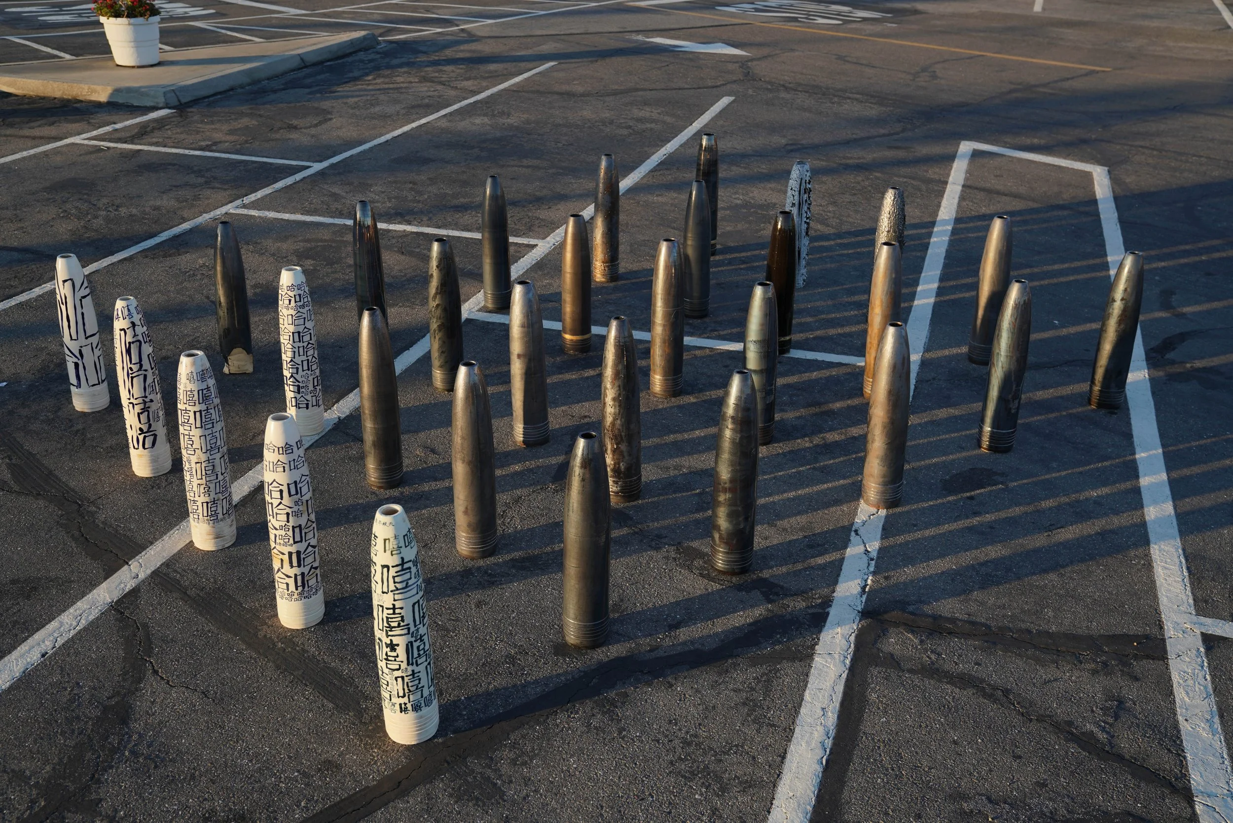 “Inspired by my residency at the Headlands Center for the Arts, located in a repurposed army barracks within a former military base, I created ‘Flower Vessels.’ I employed pottery techniques to craft a large formation of vases resembling 155 mm howitzer shells.