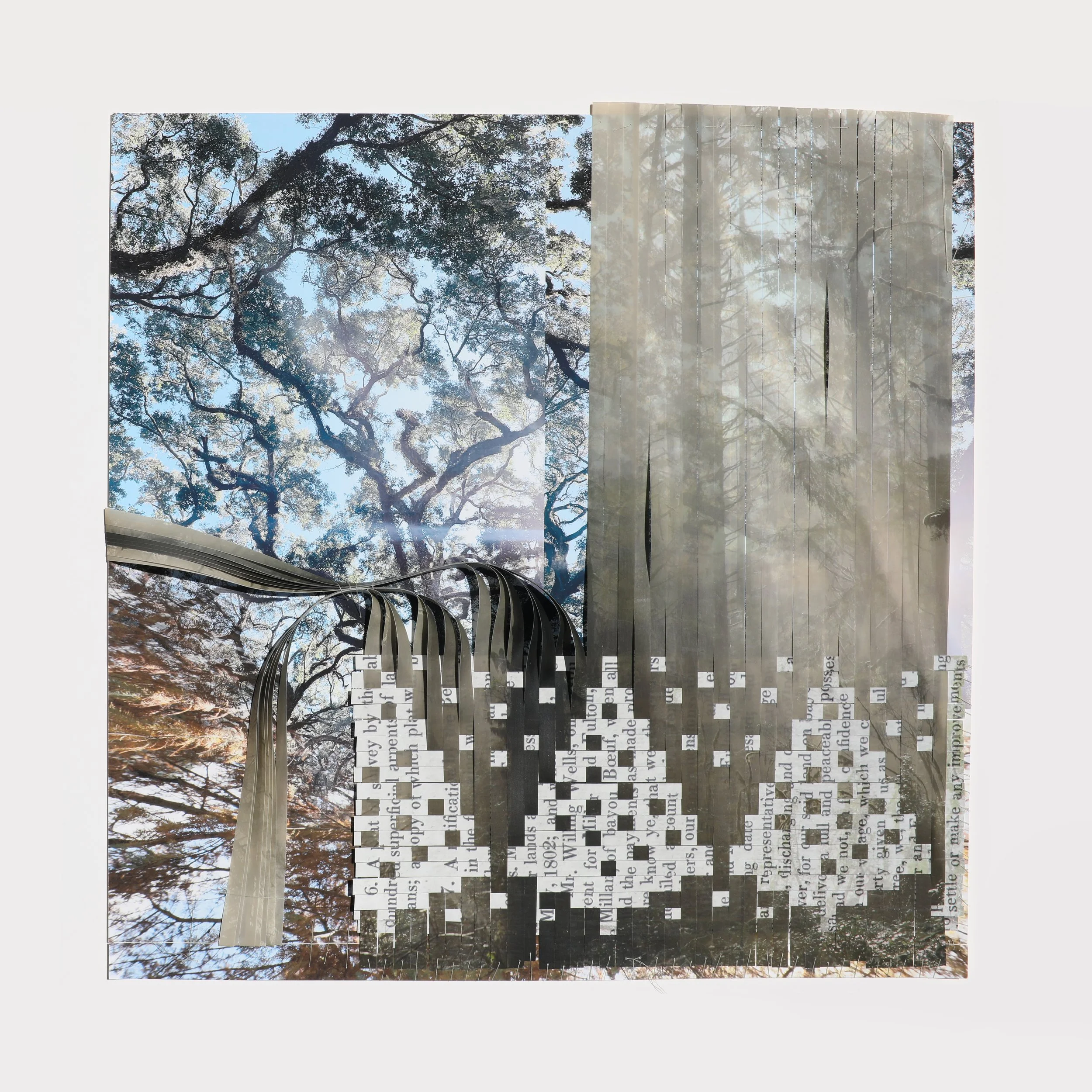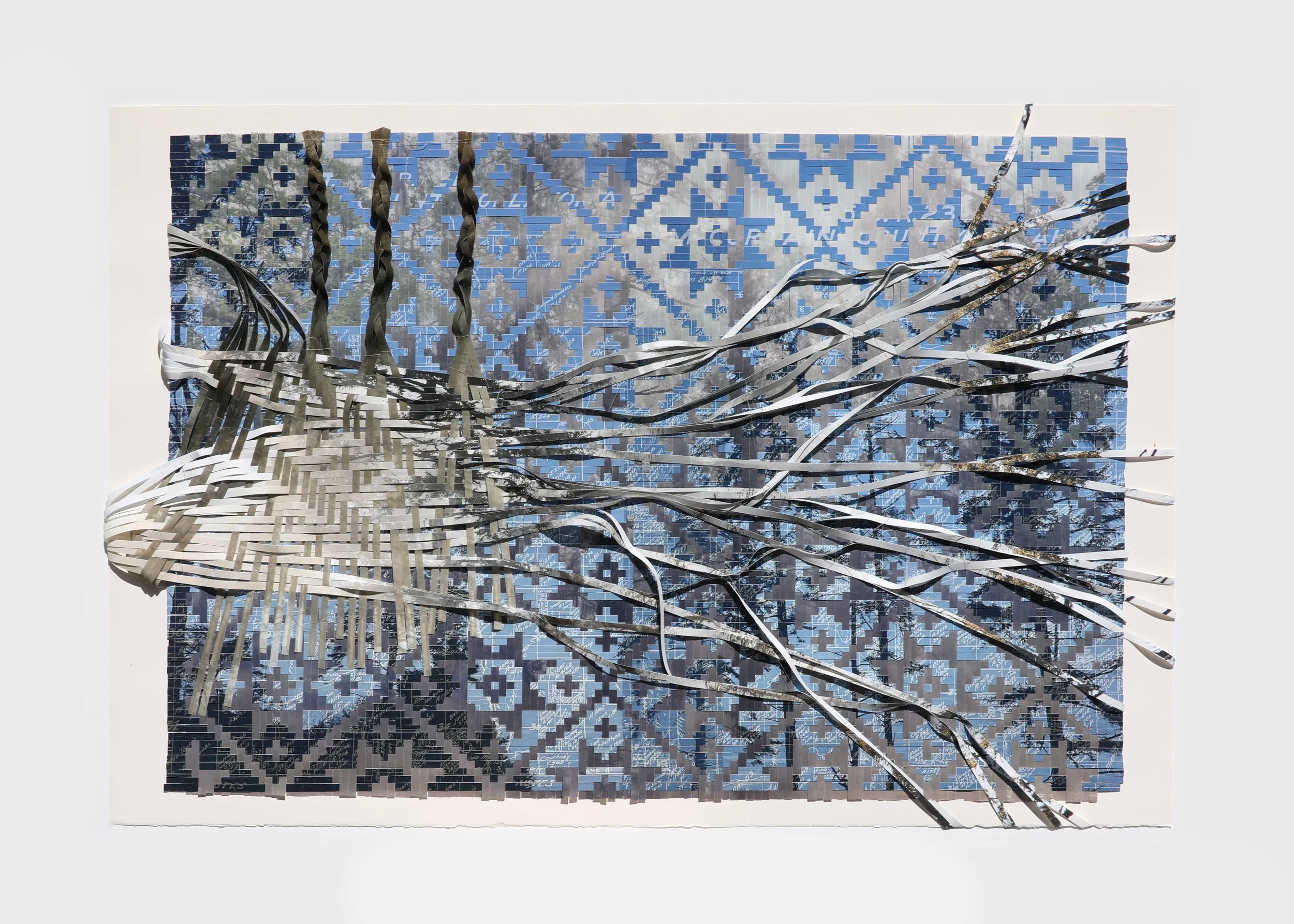 Across the series, Sense weaves traditional basket patterns through materials sourced from institutions such as the British Library, the American Antiquarian Society, and the Choctaw Cultural Center. Landscapes from Louisiana, Oklahoma, and California intersect with historical documents, tracing Indigenous movement, land loss, and survival across generations.