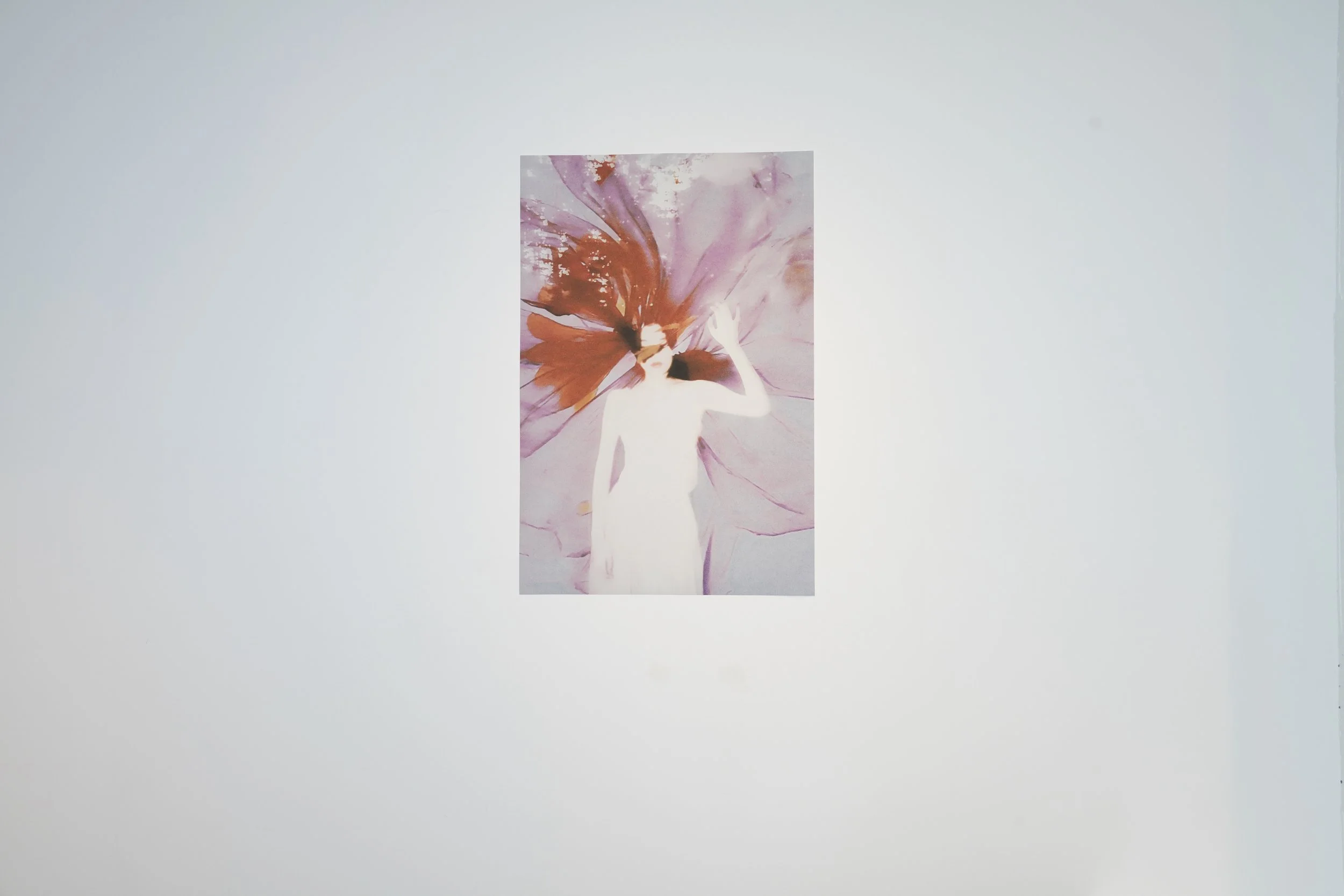 A second body of Wendy's work removes the face entirely. Everyday objects and fragments of scenes stand in for the figure, and the owner is given to us through the relations between them. Weican Wang's photographs, hung in the same direction, carry this line forward: flowers, light, tree stumps, clothing, the edges of a scene. When the figure is absent altogether, the inhabitant's face returns in its faintest and most persistent form, sensed through the angle at which something has been placed, through the traces that have been left, through the atmosphere of someone having just passed through the image. The face is not denied; it is diluted into a scene larger than itself, becoming a feature of the state rather than its source.