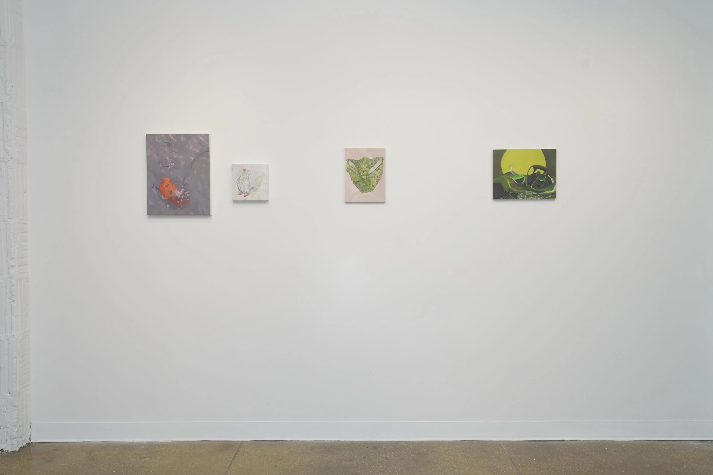 The space itself is arranged as an act of looking. Portraits by Wendy Wei and Aubrey LaDuke are gathered on one wall; paintings by Hongyu Zhang hang on the wall opposite. The figures regard one another across the room, their gazes crossing in mid-air in a conversation that is neither voiced nor answered. The exchange is produced not by any single work but by the curatorial logic of the space, which rewrites the relation between these paintings into something the works on their own could not perform. Recognition is lifted out of the interior of the work and raised to the scale of the room. Running parallel to this exchange, Weican Wang's photographs and a second body of Wendy Wei's work, built around objects rather than figures, extend the question of the face into a territory where the face no longer appears.
