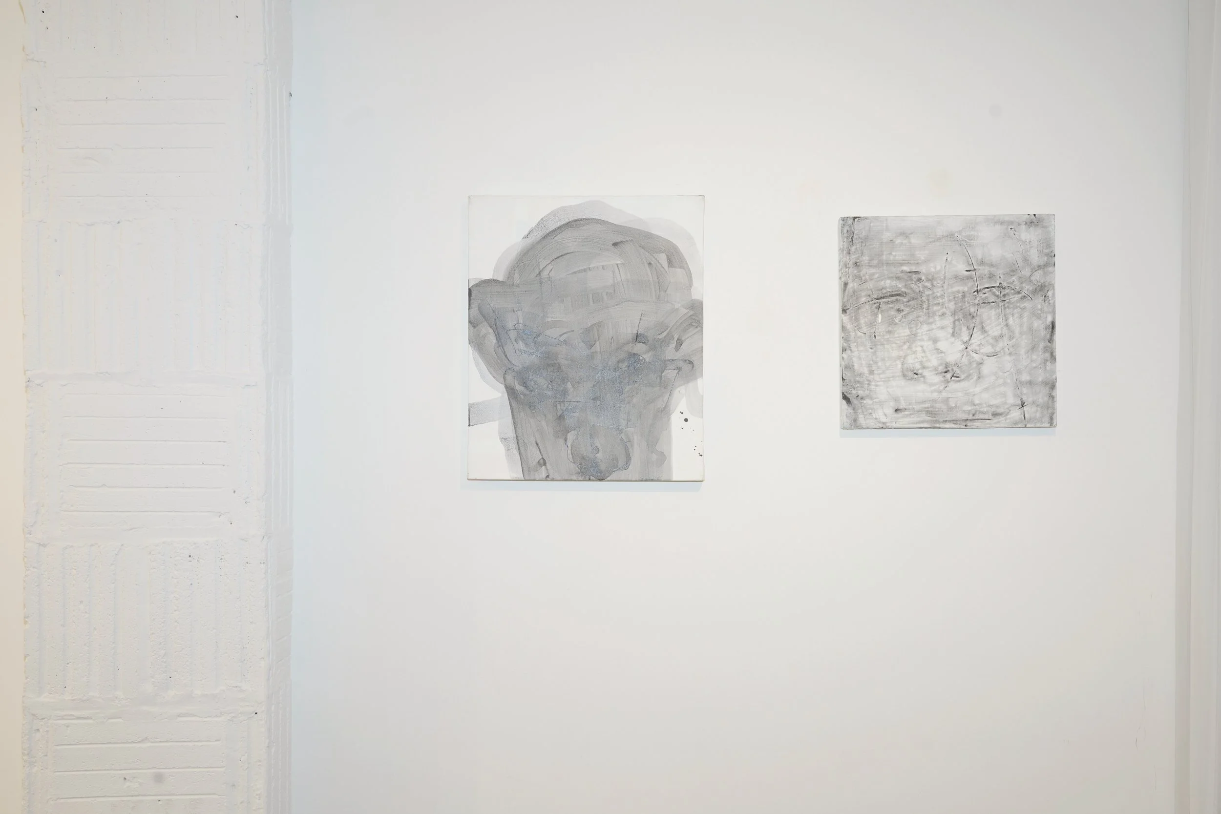 Aubrey LaDuke's Mirror series approaches the same question from another direction. Her aluminum panels are modest in scale, their frontal self-portraits close enough to read, at first, as identical. Difference is held in finer registers: a shift in the angle of the gaze, a slight misalignment of expression, a small turn between warm and cool. The mirror no longer functions as an instrument of self-confirmation; it is closer to an incomplete psychological archive, a sequence of states resembling one another without ever fully coinciding, none of them designated as the original. Hung opposite Hongyu's, these portraits begin to participate in the line of sight running through the room, forming an exchange between a self under revision and a face held in suspension.