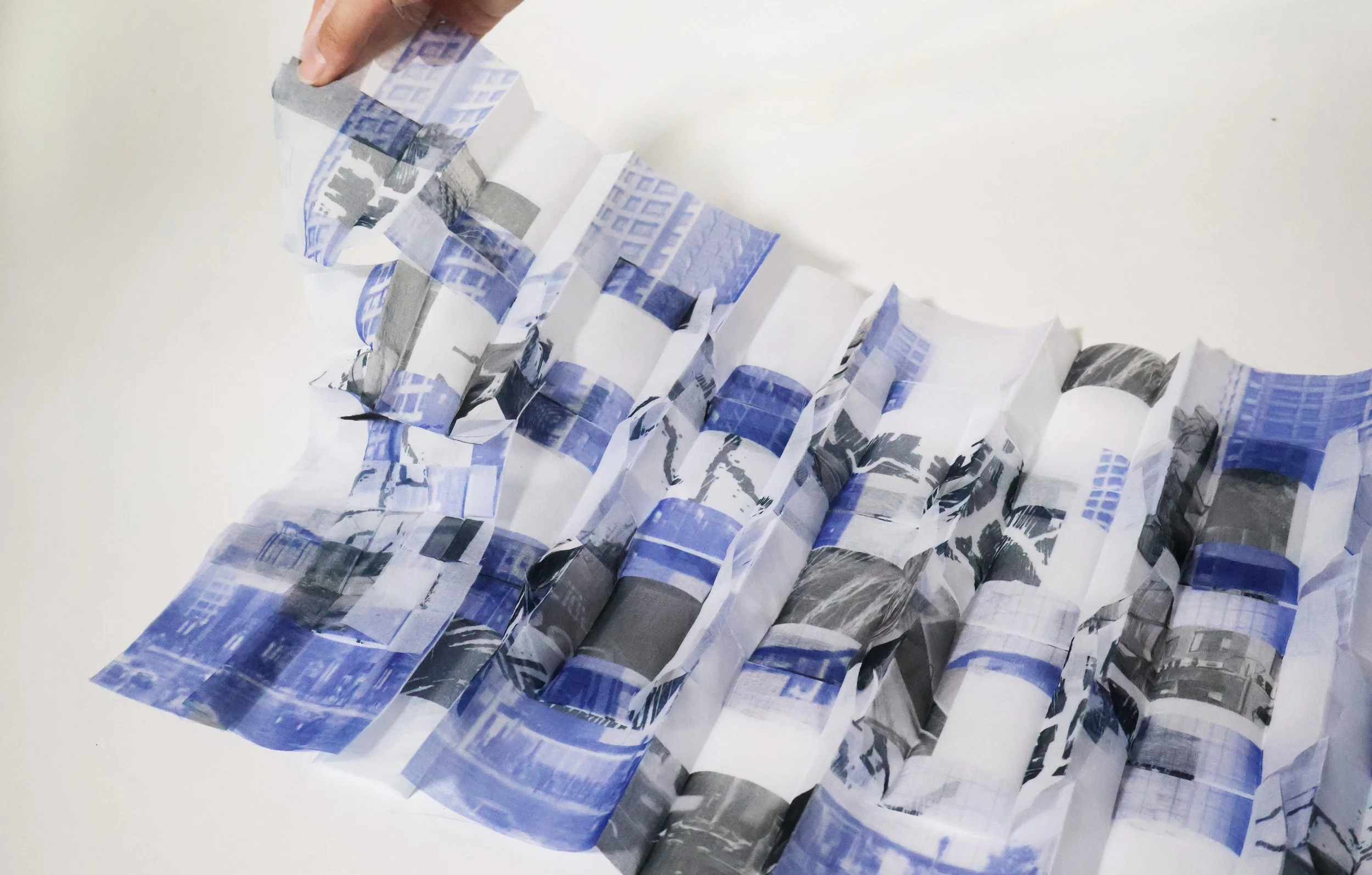 I explored this through two research areas. One of which investigated how textiles can create multi-sensory spatial experiences using light and layered materials, and the other examined how folding and layering techniques can visually express the accumulation and erasure of memory in urban spaces.